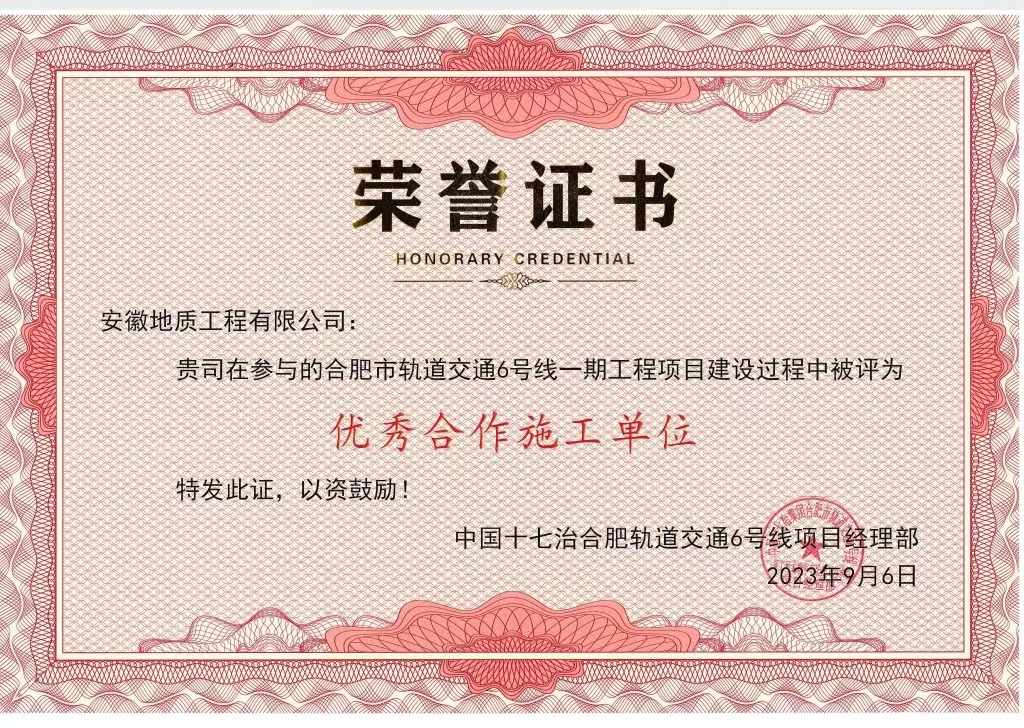 近日,建投集團(tuán)所屬安徽地質(zhì)工程有限公司喜獲中國十七冶合肥軌道交通6號線項(xiàng)目經(jīng)理部頒發(fā)的“優(yōu)秀合作施工單位”榮譽(yù)稱號,這是對地質(zhì)工程公司在該項(xiàng)目施工過程中的突出表現(xiàn)的肯定。