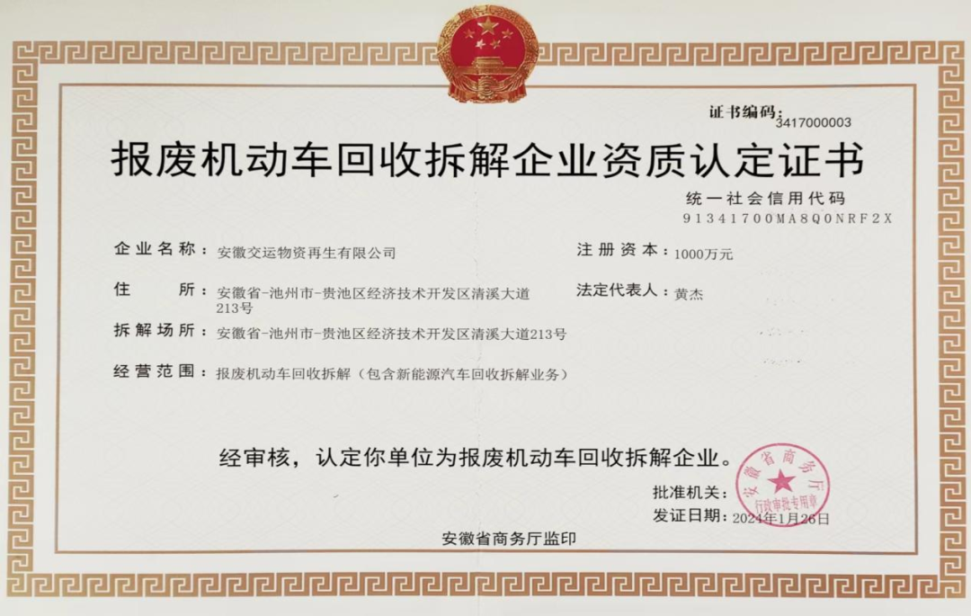 近日,集團(tuán)所屬安徽交運物資再生有限公司順利通過安徽省商務(wù)廳批準(zhǔn),成功獲得報廢機(jī)動車回收拆解企業(yè)資質(zhì)認(rèn)定證書 。
