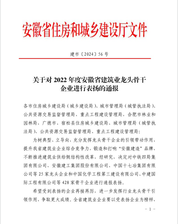 4月10日,安徽省住房和城鄉(xiāng)建設(shè)廳發(fā)布了《關(guān)于對(duì)2022年度安徽省建筑業(yè)龍頭骨干企業(yè)進(jìn)行表?yè)P(yáng)的通報(bào)》,集團(tuán)所屬池州市規(guī)劃勘測(cè)設(shè)計(jì)總院有限公司榮登榜單。